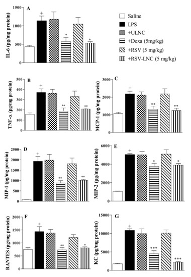 Effect of treatment with RSV or RSV-LNCs on pulmonary cytokine levels induced by LPS instillation. Mice were orally treated with ULNCs, Dexa, RSV or RSV-LNCs (5 mg/kg) 6 h after intranasal exposure to LPS (25 μg/25 μL). After 24 h of LPS instillation, fragments of right lungs were perfused and collected to measure (A) IL-6, (B) TNF-α, (C) MCP-1, (D) MIP-1, (E) MIP-2, (F) RANTES and (G) KC levels by ELISA. Data are expressed as the mean ± SEM from 6–8 animals. + p < 0.05 compared with the saline group; * p < 0.05; ** p > 0.01 and *** p > 0.001 compared to the LPS group.