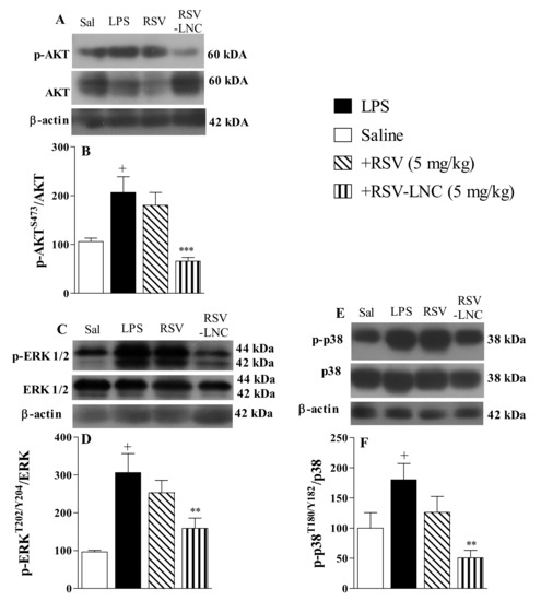 Effect of treatment with RSV or RSV-LNCs on pro-inflammatory molecular pathways underlying lung injury induced by LPS instillation. Mice were orally treated with ULNCs, Dexa, RSV or RSV-LNCs (5 mg/kg) 6 h after intranasal exposure to LPS (25 μg/25 μL). After 24 h of LPS instillation, fragments of right lungs were perfused and collected for pro-inflammatory protein expression quantification. Representative Western blot images of phosphorylation and total (A) AKT, (C) ERK1/2 and (E) p38 and densitometric values of (B) AKT and (D) ERK1/2 and (F) p38 normalized to their respective controls that were not exposed to LPS (control bar; 100%). Data are expressed as the mean ± SEM from 5–9 animals. + p < 0.05 compared to saline; ** p < 0.01 and *** p < 0.001 compared to LPS group.