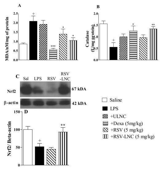 Effect of treatment with RSV or RSV-LNCs on oxidative imbalance induced by LPS instillation. Mice were orally treated with ULNCs, Dexa, RSV or RSV-LNCs (5 mg/kg) 6 h after intranasal exposure to LPS (25 μg/25 μL). After 24 h of LPS instillation, fragments of right lungs were perfused and collected for analysis of (A) malondialdehyde, (B) catalase enzyme levels and posterior quantification of Nrf2 expression. (C) Representative western blot images of Nrf2 and (D) densitometric values obtained for β-actin and Nrf2 quantification, normalized to saline control (control bar; 100%). Data are expressed as the mean ± SEM from 5–8 animals. + p < 0.05, compared to saline; * p < 0.001; ** p < 0.05 and *** p < 0.0001, compared to the LPS group.
