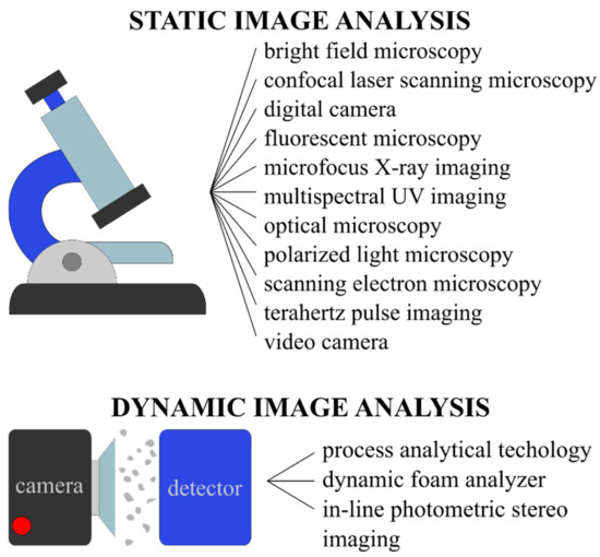 Image analysis can be categorized as static or dynamic based on the image acquisition method used (Figure 1). Static image analysis is performed when the particles are still and motionless, such as in optical or scanning electron microscope images. It has to be noted that for this type of analysis the limited count of measurements along with the sampling size or segregation can lead to result inaccuracies, and the results are also highly influenced by sample preparation. On the other hand, dynamic image analysis is carried out on samples where the particles are dispersed in a gas or liquid medium or on a conveyor, and a high-speed matrix or line camera is used for image capturing. Dynamic IA results are repeatable but in shorter times they stand out in robust statistics. The importance of performing particle size analysis using image analysis methods is also proven by the fact that ISO guidelines also cover the topics of both static and dynamic methods [9,10,11].