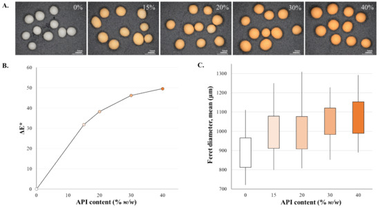 The ΔE values (average of 10 pellets) were plotted over the API content (% w/w), and the scatter plot is shown on Figure 2B. Pellet size analysis was also carried out (Image Pro Plus; Media Cybernetics, Bethesda, MD, USA) and the mean Feret diameters are shown in the box plot of Figure 2C.