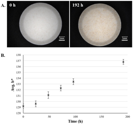 The importance of appropriate storage conditions has long been known. Temperature, moisture, light, and ventilation are just some factors that need to be considered, as, among others, they highly influence the stability of tablets [79]. According to the European Pharmacopoeia, the specific storage conditions are determined by the competent authorities, the pharmacopoeial information and recommendations are mainly for the prevention of contamination and deterioration [1]. Image analysis can be applied as a brief evaluation technique for the color change of tablets stored under different conditions. Figure 4A shows tablets of the same batch stored for up to 192 h in 40 °C and 75% relative humidity. As in Section 2.1.4, the change in the color was analyzed from digital microscopic (Keyence VHX-970F; Keyence Corp., Japan) pictures (2048 × 1536 pixels; 10 photo/sample) and the L*a*b* color space was used for the numeric description of the yellowness. As expected, the rise in the value of b* (positive value indicates yellow) was parallel with the increasing storage time (Figure 4B).