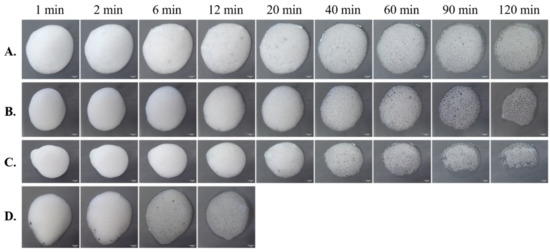 - Guillerme, C.; Loisel, W.; Bertrand, D.; Popineau, Y. Study of Foam Stability by Video Image Analysis: Relationship with the Quantity of Liquid in the Foams. J. Texture Stud. 1993, 24, 287–302. [Google Scholar] [CrossRef]