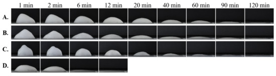Redfearn et al. studied orodispersible films in an in vitro oral model where image analysis was used to determine the volume reduction of the film matrix over time, which well describes the disintegration behavior of the film [77].