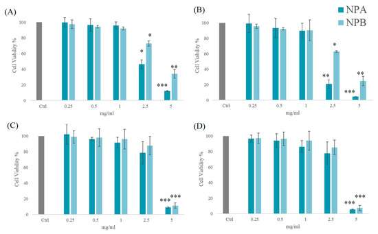 From the results obtained, it was observed that NPA and NPB showed similar behavior on both cell lines. In detail, absence of cytotoxicity was observed in pericyte cell lines with a wider concentration range (0.25–2.5 mg/mL) than in endothelial cells (0.25–1 mg/mL).