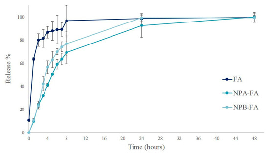 NPB-FA showed a lower drug loading than NPA-FA made up of PLA polymer. The lower EE could be attributed to the lower ability of a drug interaction with the polymer. This capacity depends on the drug interaction with the matrix, therefore the more of the drug that is akin to the polymer, the greater the amount of encapsulated FA will be [59].