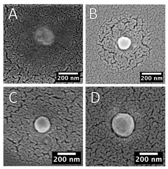 NPs morphology was assessed by SEM study. The samples were prepared for the electron microscope with a spin-coating procedure at 500 rpm for 1 min with a Suss Microtech instrument and left to dry in air for a few hours. To ensure good conductivity, all of the samples were then coated with 5 nm of gold sputtering at a pressure of 10−3 mbar with an Emitech K500X equipment. The SEM were acquired at a low voltage of 3 KV with an InLens detector by using a Field Gemini microscope from Zeiss.