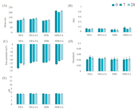 The results obtained from the stability studies conducted on lyophilized systems resuspended with distilled water and stored at refrigeration temperature have shown a chemical-physical stability almost unchanged over time. The data collected are shown in Figure 4. PCS analysis provided further confirmation of the reduction in the mean size of the systems (Figure 5A), which remained stable during the storage time considered. In addition, the PDI of all the analyzed formulations maintained constant values, always below 0.2 (Figure 5B). From the analysis of the ZP (Figure 5C) it is possible to observe a slight decrease in this parameter over the course of 28 days, despite the fact that the surface charge of the systems always remains greater than −20.5 mV. In general, dispersions with high absolute values of ZP are considered stable because the electrical repulsion between the charges of the NPs is able to reduce the aggregation capacity of systems [61,71]. Therefore, NP formulations were found to be physically stable, and aggregation of colloidal particles was probably prevented due to adequate values of ZP. Figure 5D,E show respectively measurements of osmolarity and pH values of the NPs suspensions, whose variations over time have proved to be practically irrelevant.