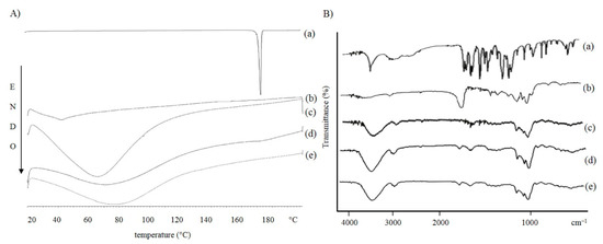 As shown in the curves (a) of both graphs, the melting point of FA is 172.3 °C, which represents the characteristic endothermic peak of the drug [72]. The disappearance of the characteristic endothermic FA peak in the thermograms of FA-loaded NPs [Figure 6A and Figure 7A(e)] demonstrates that the drug could be successfully entrapped in the amorphous state within the formulated systems.
