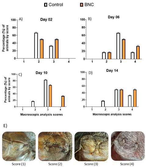 Descriptive macroscopic evaluation of the surgical wounds of animals from Experiment I (n = 12) by score at 2 days (A), 6 days (B), 10 days (C), and 14 days (D) post-surgery. In letter (E), typical images for each score, been: 1—Moderate inflammation, no epithelialization; 2—Mild inflammation, initial epithelialization; 3—No inflammation, presence of epithelialization; 4—Hair growth, signs of epithelialization. Control group = standard treatment (antisepsis with topical PVPI solution followed by larvicidal repellent); BNC group = standard treatment + bacterial nanocellulose membrane.