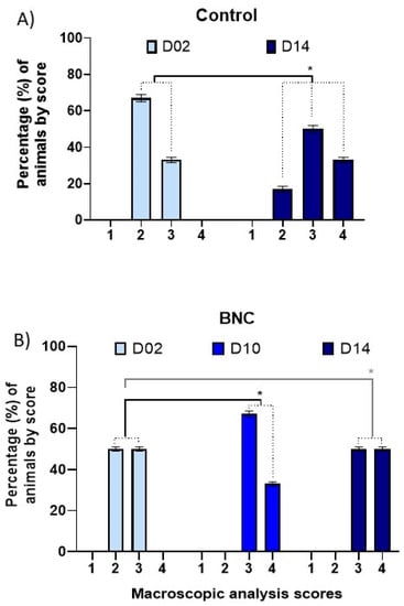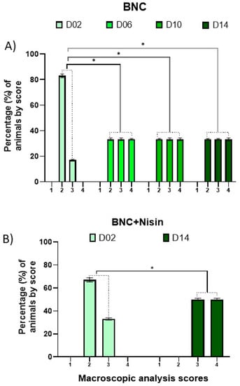 Influence of time for intragroup analysis of healing process (n = 12). Macroscopic evaluation of surgical wounds of animals from Experiment II. In (A) BNC group = standard treatment + bacterial nanocellulose membrane; comparison of data among days 2, 6, 10 and 14; * p < 0.05. In (B) BNC+Nisin group = standard treatment + Nisin loaded in bacterial nanocellulose membrane; comparison of data among days 2 and 14; * p < 0.05.
