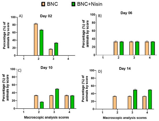 Regarding Experiment II (BNC and BNC+nisin), the evolution of healing is reported in Figure 3. In day 2 (Figure 3A) 33% of the animals from the BNC+nisin group had a healing score of three compared to 17% of the animals in the BNC group. On day 6 (Figure 3B) both groups exhibited the same percentages of animals/score. On day 10 (Figure 3C), the same percentage of animals were at a healing score of four, while on day 14 (Figure 3D), 50% of the animals in the BNC+nisin group were at score four, as compared to 33% of the BNC group.