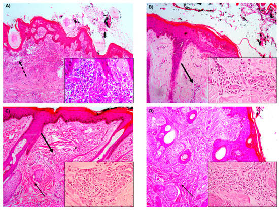 Photomicrographs of the slides at the different times of the skin biopsies stained by hematoxylin and eosin at 100× and 400× (insets) magnification; (A) animal in the control group at 7 days, with active inflammation, characterized by marked inflammatory infiltrate (inset); (B) animal in the membrane group, 7 days, with chronic inflammation, noting the beginning of tissue reorganization and decrease of inflammatory cells with mononuclear pattern (inset); (C) animal in the membrane group, 14 days, with chronic-active inflammation (inset), with areas of fibrosis and edema; (D) animal in the membrane+nisin group, 21 days, with chronic-active inflammation (inset), greater tissue reorganization, areas of fibrosis, and cellular accumulation of restructuring. Note: the dotted arrow indicates area of edema; thick arrow indicates area of inflammatory infiltrate; thin arrow indicates area of fibrosis.