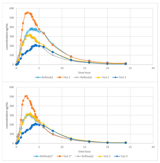 To do so, the present study dealt with the combination of data obtained in two different BE studies. To allow the adequate comparison of both data sets, a normalization procedure based on the reference’s concentration ratios was used [18]. After normalization, both reference profiles were superimposable and the difference between test products was on the same extent scale.