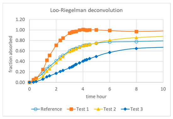 Figure 2 summarizes the Loo–Riegelman absorption analysis. The absorption profiles were clearly different for the non-bioequivalent formulation (Test 1 and Test 3), whereas the bioequivalent one (Test 2) showed a very similar absorption rate with a slightly higher asymptotic value in concordance with the Cmax and AUC ratios.