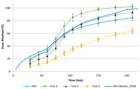 According to the initial in vitro dissolution results obtained with the different conditions tested with method 2, the Test 1 formulation was initially selected for a first in vivo bioequivalence study. In this first trial, Test 1 was found to be supra-available, and a second in vivo trial with the two other test formulations was performed in which Test 2 formulation proved to be bioequivalent.