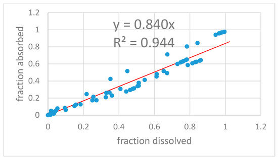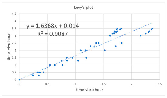 To account for the slight difference in time scale of in vitro and in vivo dissolution, a Levy plot was constructed (see Figure 7). A Levy plot represents the relationship between the in vitro and in vivo times needed for the dissolution/absorption of a given fraction. The times for in vitro dissolution of a given fraction (fabs) were estimated from the Weibull equation (Equation (2)).
