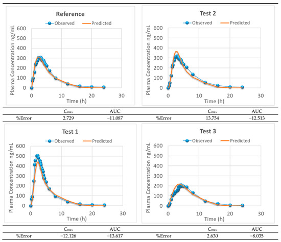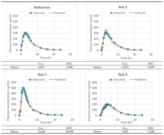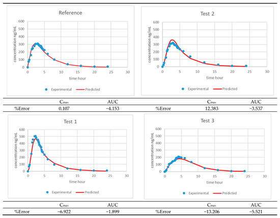 Level-A IVIVC was constructed with dissolved and absorbed fractions up to 3.5 h. The two-step IVIVC calculated with the four products is represented in Figure 8. Once the level-A correlation was obtained, the predicted fractions absorbed from the fractions dissolved and the level-A equation were convoluted again using the inverse Loo–Riegelman procedure [10] to get the predicted plasma levels. The predicted and experimental plasma levels are represented in Figure 9 with the internal prediction errors.