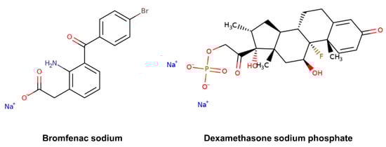 Chemical structure of the selected ophthalmic drugs: bromfenac sodium (MW 356.15 g/mol) and dexamethasone sodium phosphate (MW 516.42 g/mol).