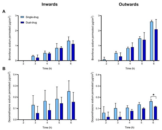 Cumulative amount of drug permeated through the cornea over time: bromfenac sodium (A) and dexamethasone sodium (B). Single- or dual-drug solutions with 125 µg/mL of each drug were placed in the donor chamber. Experiments were conducted in inward (left column) or outward (right column) flux direction through the cornea. Mean values and standard deviations (n = 3); * t-test; p < 0.05.