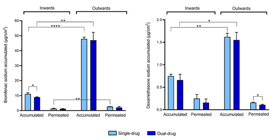 Bromfenac sodium (left) and dexamethasone sodium (right) accumulated in the cornea and permeated to the receptor chamber (normalized per unit area) in an inward or outward corneal configuration when tested as a single-drug solution (Single-drug) or dual-drug solution (Dual-drug). Mean values and standard deviations (n = 3); t-test * p < 0.05; ** p < 0.01; **** p < 0.0001.