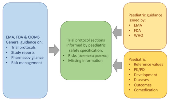 Based on existing general and paediatric guidance documents, issued notably by CIOMS, the EMA and FDA, a figure was developed showing how the paediatric safety specification informs risk management and pharmacovigilance in a paediatric protocol (Figure 3) [4,5,6,10,12,23,24,26,28].