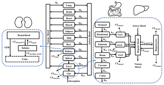 A whole-body PBPK model involving interplay of OCTs and MATEs in intestine, liver and kidney (Figure 1) was developed. The formulas for building the whole-body PBPK model are shown as follows.