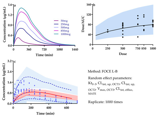 (a) Predicted plasma concentrations of metformin following different dosage of human. (b) Predicted (line) and observed (point) relationship between metformin dose and dose/AUC for different dose; shaded area, 0.5–2.0 folds of prediction; observations were cited from [13,15,16,19,20,27,68,69,84,88,89,90,91,92,93,94,95,96,97,98,99,100,101,102,103,104,105,106,107,108,109,110,111,112,113]. (c) Visual predictive checks (VPCs) of metformin plasma concentrations to time in 500 mg oral administration for human; solid line, the 50th percentiles; dashed lines, the 5 and 95th percentiles of the simulated populations; the shaded area, 90% confidence intervals of the simulated concentrations of the 5, 50 and 95th percentiles; and the point, observations, which were cited from [27,69,91,93,97,114].