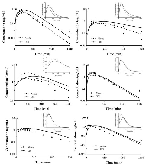 Predicted (line) and observed (points) plasma concentrations of the metformin alone and co-administrated with (a) cimetidine, (b) pyrimethamine, (c) trimethoprim, (d) ondansetron, (e) rabeprazole and (f) verapamil. Insert plots indicated concentrations of metformin in liver. Observations were cited from reports [13,14,16,19,27,99]. Concentration of metformin in liver have no clinical data.