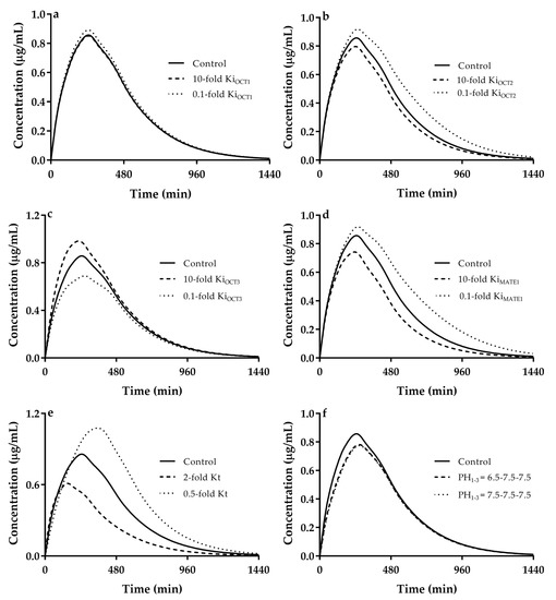 Effects of alterations in inhibition constant Ki values of cimetidine for (a) OCT1, (b) OCT2, (c) OCT3, (d) MATEs, (e) gastrointestinal transit rate constant and (f) intestinal pH on metformin disposition.