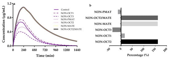 Individual contributions of (a) the integrated effects (CLint,up,OCT2 + CLint,efflux,MATEs, NON-OCT2/MATE), renal CLint,efflux,MATEs (NON-MATE), renal CLint,up,OCT2 (NON-OCT2), liver CLint,up,OCT1 (NON-OCT1) and intestinal Vmax,OCT3 (NON-OCT3), Vmax,PMAT (NON-PMAT) to plasma concentration of metformin; (b) contributions of renal CLint,up,OCT2, renal CLint,efflux,MATEs, intestinal Vmax,OCT3, intestinal Vmax,PMAT and liver CLint,up,OCT1 to AUC of metformin. The percentage (%) is defined as ((AUCnon transporter − AUCcontrol)/AUCcontrol) × 100%.