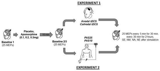 In the present study, we thus aimed to explore the effect of the unspecific dopamine agonist apomorphine on M1 plasticity in healthy humans. In two separate experiments, we tested the impact of apomorphine on nonfocal plasticity induced by tDCS (Experiment 1) and focal plasticity induced by PAS (Experiment 2). Based on available studies, we hypothesized that apomorphine would exert an induction protocol-dependent effect on M1 plasticity similar to L-DOPA.
