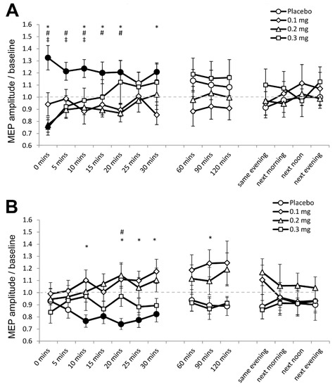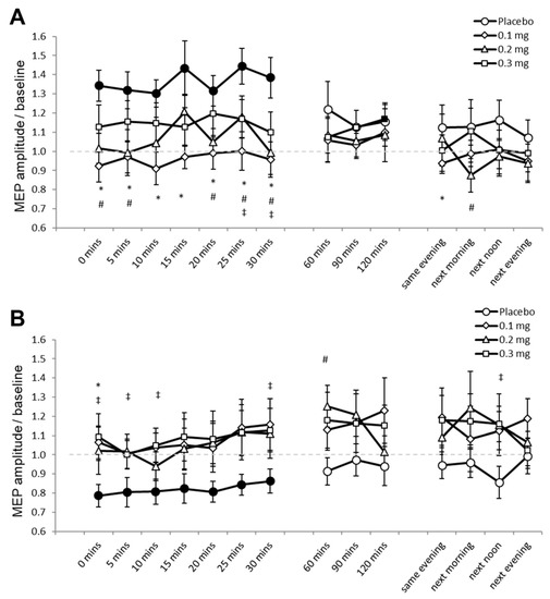 Effects of apomorphine on nonfocal plasticity induced by anodal and cathodal tDCS (Experiment 1). The x-axis displays the time points (in minutes) of post-stimulation measurements. The y-axis displays the mean MEP amplitudes after stimulation (MEPs were standardized to the corresponding baseline values for each participant). The graphs show that under placebo medication anodal tDCS enhanced excitability, and cathodal tDCS diminished excitability for ∼30 min after stimulation. (A) Low-dose (0.1 mg) abolished, medium-dose (0.2 mg) and high-dose (0.3 mg) transiently reversed the after-effect of anodal tDCS. (B) All dosages of apomorphine abolished the after-effect of cathodal tDCS. Filled symbols indicate statistically significant deviations of the post-tDCS MEP values compared with baseline. *, # and ‡ symbols indicate significant differences of the real medication compared with the placebo medication conditions at the same time points after plasticity induction (Bonferroni corrected, two-tailed, paired t-test, p ≤ 0.05). Error bars show standard error of mean (SEM). * 0.1 mg of apomorphine, # 0.2 mg of apomorphine, and ‡ 0.3 mg of apomorphine.