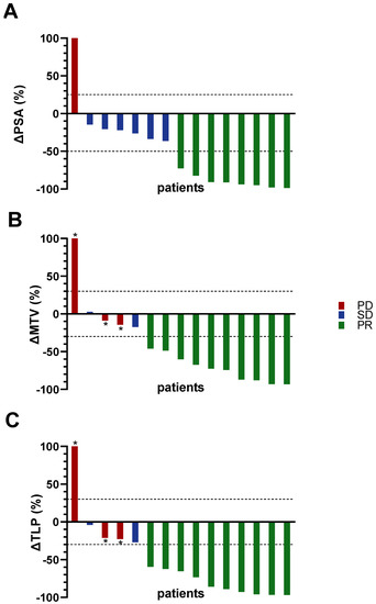 Waterfall plots of individual changes in (A): PSA serum value; (B): MTV; (C): TLP. Red: progressive disease (PD). Blue: stable disease (SD). Green: partial remission (PR). * Appearance of new metastases.