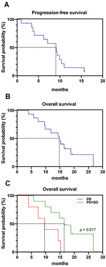 Patients showing partial remission by molecular imaging after two cycles reached a median OS of 16.5 months (CI: 9.8–19.4 months), whereas patients showing either stable or progressive disease only reached a median OS of 9.6 months (CI: 4.0–15.2 months) (Figure 3C). The difference in median OS was statistically significant (p = 0.017, log-rank test). In contrast, no significant difference (p = 0.116, log-rank test) in OS was noted between patients showing biochemical partial remission and those with biochemical stable or progressive disease. Median OS values were identical compared to molecular imaging, 9.6 months (CI: 4.0–26.7 months) for patients with biochemical stable or progressive disease and 16.5 months (CI: 9.8–19.4 months) for patients showing partial remission.