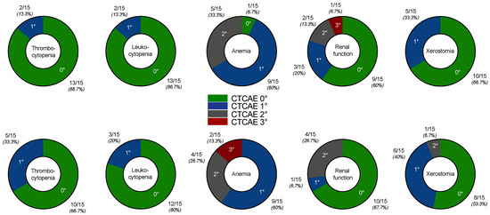 Graphical illustration of CTCAE grades for thrombocytopenia, leukocytopenia, anemia, renal function impairment and xerostomia at baseline (upper row) and after two cycles of [177Lu]Lu-PSMA-617 RLT with at least one [225Ac]Ac-PSMA-617 augmentation (lower row).