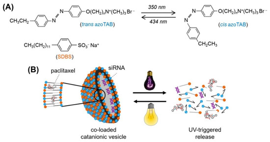 Photo-responsive nanovehicles using photosensitive chemistry have been developed and studied, providing the capacity for incorporation of drugs, targeting tumor sites, controlled drug release through direct modification of the chemical structure of materials, or decomposing the materials under light illumination. First, cis and trans isomerization of photo-reactive nanovehicles is a common strategy that has been used for changing the polarity of materials with azobenzene or spiropyran (SP) and for promoting the release of the drug payload [47]. In the case of azobenzene, when materials include a conjugated π system with strong absorption from UV to visible red light, the cis isomer of azobenzene is converted to trans-azobenzene [48]. It shows a strong π−π transition in the UV region and a weak π−π transition in the visible region. Photo-isomerization of the azobenzene group can regulate light-induced drug release. For instance, Seidal et al. developed an azobenzene-based photo-responsive carrier composed of azobenzene trimethylammonium bromide (azoTAB) and sodium dodecylbenzenesulfonate (SDBS), which showed reversible photo-isomerization for the treatment of breast cancer. As shown in Figure 1, the vesicle carriers formed from the longest trans-azoTAB showed higher siRNA and paclitaxel encapsulation and more effective transfection. The drug co-loading vesicle carriers can enhance cell death and anti-apoptotic B-cell lymphoma-2 protein suppression due to UV-triggered release of the drugs from the ruptured vehicles [32].