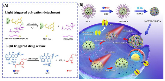 Another nanovehicle strategy using UV irradiation is photo-induced cleavage using agents such as o-nitro benzyl and coumarinyl ester. The drugs connected through these linkages can be released through irreversible cleavage, under the light illumination of the appropriate wavelength. o-nitro benzyl and its derivatives cause a series of radicular mechanisms and hydrogen abstraction by UV light (365 nm) irradiation, releasing the connected molecules [52]. Another favorable photo-inducible cleavage material, coumarinyl ester, has exhibited strong fluorescence and light energy release [53]. The coumarinyl ester is irreversibly cleaved in response to UV light. Usually, coumarin is incorporated into a polymer through an ester bond for imparting hydrophobic properties. The ester bond is cleaved by an external light stimulus and the remaining polymer backbone frame forming a carboxylic acid structure leads to the collapse of the nanovehicle owing to its hydrophilic nature [54]. Wu et al. developed a photo-responsive mesoporous silica nanoparticle (MSN) using both o-nitro benzyl and coumarinyl ester as a co-delivery vehicle for P-glycoprotein short-hairpin RNA (shRNA) and DOX. MSN was linked to PDMAEMA by coumarin ester bonds (MSN-Cou-PDMAEMA) (MCP) for the photo-responsive release of shRNA and incorporated with DOX in combination with hexadecyl-o-nitrobenzyl. The shRNA and DOX were released when sequentially irradiated with UV light of 405 nm and 365 nm, respectively, resulting in synergistic effects in multidrug-resistant HepG2/ADR human liver cancer cells (Figure 2) [34].
