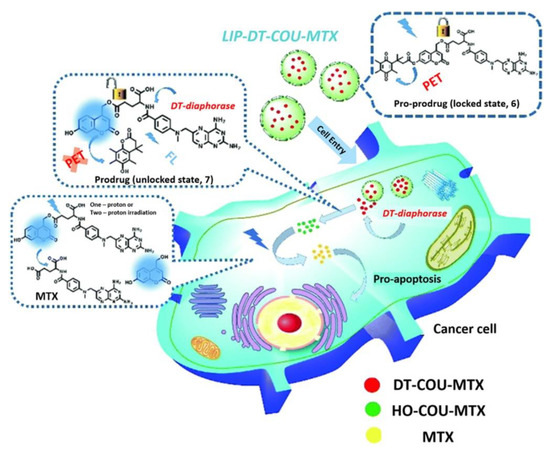 Compared to UV light, which has limitations in clinical practice such as low penetration depth, risk of cell damage, and attenuation by blood and soft tissue, NIR rays with a wavelength of 700~1000 nm exhibit considerable penetration features and low toxicity to normal cells; the latter have been utilized as a favorable light source for triggering drug release in photo-responsive nanovehicles [55,56]. Wu et al. reported an enzyme-reactive, two-photon NIR-reactive pro-prodrug nanosystem for cancer detection and therapy. The nanosystem was composed of methotrexate (MTX), DT-diaphorase-responsive quinone propionic acid, and photo-responsive coumarinyl (DT-COU-MTX). DT-COU-MTX can release the drug when subjected to two external stimuli, enzyme and light. In the absence of DT-diaphorase, quinone propionic acid inhibited coumarin fluorescence and photo-responsive cleavage through photo-induced electron transfer. In contrast, in the vicinity of cancer cells overexpressing DT-diaphorase, the coumarin fluorescence of the pro-prodrug was activated and could be monitored to detect the tumor. Thereafter, MTX in the form of a prodrug (HO-COU-MTX) was released through cleavage of the bond by two-photon NIR irradiation, resulting in high cytotoxicity toward cancer cells with less effect on normal cells (Figure 3) [35]. Another NIR-reactive substance, diazo-1,2-naphthoquinone, undergoes Wolff rearrangement via photon induction. It is easily converted to the hydrophilic 3-indenecarboxylic acid (pKa 4.5). This Wolff rearrangement reaction can be generated by one high-energy UV photon and two low-energy NIR photons. Therefore, it can be effectively applied to NIR-triggered drug release systems [57,58,59,60].