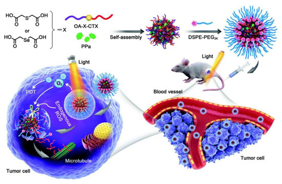ROS-triggered linker cleavage can also be exploited for controlled drug delivery with light exposure in ROS-activatable prodrug nanoplatforms [95,96,97]. ROS-activatable prodrugs are commonly composed of an ROS-trigger PS, drug, and ROS-responsive cleavage linker. The ROS-trigger PS generates ROS under light irradiation, the linker can be cleaved by endogenous ROS in the tumor or exogenous ROS from the ROS-trigger PS, and the drug can be released, causing a toxic effect. Bio et al. verified a novel approach to activate prodrugs with light using an ROS-cleavable prodrug in the mitochondria by PpIX [43]. Yang et al. prepared an ROS-activatable prodrug nanoplatform composed of 1,2-distearoyl-sn-glycero-3-phosphoethanolamine-N-[methoxy(polyethylene glycol)-2000] (DSPE-PEG2k) nanoparticles incorporated with pyropheophorbide a (PPa) and thioether/selenoether-linked conjugates of cabazitaxel (CTX) and oleic acid (OA) (Figure 6) [44]. In this nanoplatform, CTX was released not only through stimulation by ROS overexpressed in tumor cells, but also through ROS production by PPa when irradiated with external light. The ROS-responsive nanovehicles showed prolonged systemic circulation and drug accumulation in the tumor, demonstrating a synergistic antitumor effect.