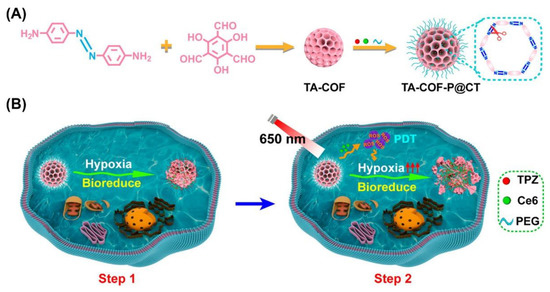 (A) Schematic illustration for the synthesis of TA-COF and TA-COF-P@CT. (B) Schematic illustration of two-step photo-activated hypoxia-responsive drug delivery toward cancer treatment. Reproduced from [46] with permission, copyright 2021, American Chemical Society.
