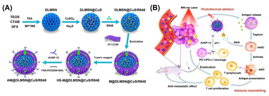 (A) Schematic illustrations for the preparation and (B) synergistic effects of AM@DLMSN@CuS/R848 against triple-negative breast cancer (TNBC) by combining photothermal ablation and immune remodeling. Reproduced from [144] with permission, copyright 2020, American Chemical Society.