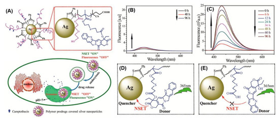 (A) Schematic illustration and intracellular release of CPT. Principle of NSET (nanoparticle surface energy transfer) “on” and “off” for the P(HEO2MA-co-MACPT)@AgNPs. Fluorescence spectra of the hybrid AgNPs after incubation in PBS solution at pH 7.4 (B) and at pH 5.0 (C) for different times. Schematic diagrams of NSET “on” (D) and NSET “off” (E) for the P(HEO2MA-co-MACPT)@AgNPs. Reproduced from [154] with permission, copyright 2017, American Chemical Society.