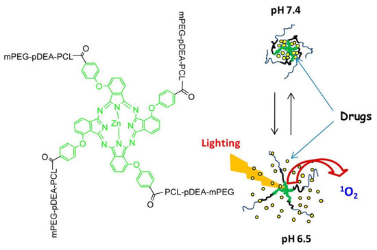 In addition, various structures such as star-shaped polymers and dendrimers have been highly utilized to construct dual stimuli-responsive nanovehicles. Zhang et al. constructed a PS core 4-armed star-shaped copolymer composed of [PEG-poly(2-(N,N-diethylamino)ethyl methacrylate) (pDEA)-PCL]4-zinc β-tetra-(4-carboxyl benzyloxyl)phthalocyanine (PDCZP) capable of targeting tumors and responding to dual stimuli, light, and pH. The pH responsiveness of PDCZP resulted from pDEA chains, which could shrink in weakly basic environments (pH 7.4) through hydrophobic interaction and, in contrast, extend in weakly acidic environments (pH 6.5 or 5.0) because of increased hydrophilicity due to protonation of the amines of pDEA. The DOX-loaded nanovehicles showed the formation of 50 nm-sized spherical particles at pH 7.4. In the nanovehicles delivered to tumor cells, the rapid DOX release was triggered by the acidic pH, resulting in enhanced antitumor effects through chemotherapy with DOX and PDT with core PS under light irradiation (Figure 10) [169].