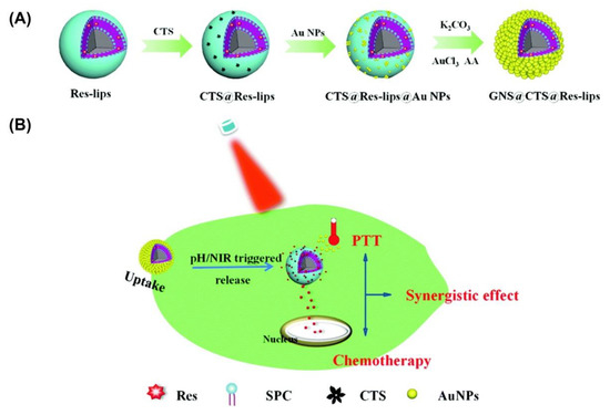 (A) Schematic representation of the synthetic strategy for GNS@CTS@Res-lips. (B) GNS@CTS@Res-lips as pH/NIR dual-responsive drug deliveries for synergistic chemo-photothermal cancer therapy. Reproduced from [170] with permission, copyright 2017, Royal Society of Chemistry.
