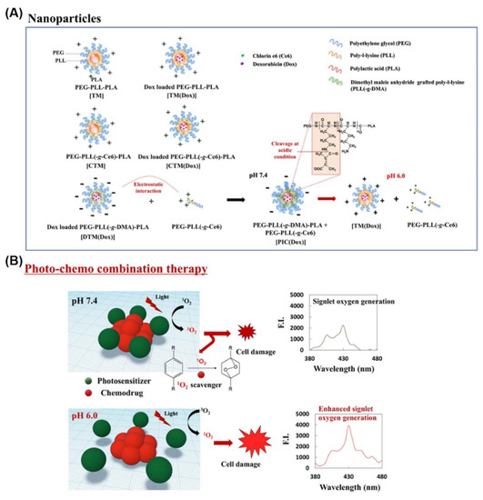 Many studies have reported the utilization of light- and pH-responsive systems for triggering the degradation/cleavage/breakage of nanovehicles. Oh’s group researched polyelectrolyte nanoparticles composed of [PEG-2,3-dimethylmaleic anhydride grafted poly(l-lysine)-poly(lactic acid)] PEG-PLL(-g-DMA)-PLA [168]. They developed a charge-reversible nanovehicle using PEG-PLL(-g-Ce6, DMA)-PLA for PDT (Figure 12). The DMA linkage to the lysine residue could be cleaved in response to a decrease in the pH of the buffer, thereby regenerating the positive charge. The nanovehicle formed a stable structure owing to the hydrophobic interaction of PLA and showed surface charge conversion at acidic pH, which improved cell absorption, resulting in increased photo-toxicity. In addition, they studied various anticancer therapies using the surface charge conversion properties of PEG–PLL(-g-DMA)–PLA. For example, they developed a novel pH-responsive poly ionomer complex system composed of PEG-PLL(-g-Ce6) and PEG-PLL(-g-DMA)-PLA. The poly ionomer complex (PIC) system modulated the distance between the PS and DOX to resolve the antagonistic effect of reducing the singlet oxygen as the distance between the two materials reduced. This system exhibited improved single anti-oxygen production and anti-tumor activity compared to conventional nanovehicles because of changes in the distance in the PIC system under acidic conditions [171].