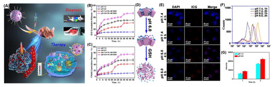 (A) Graphical abstract of chemo-drug-gated biodegradable hollow mesoporous organosilica nanotheranostics. In vitro ICG (B) and 17AAG (C) release profiles from ICG–17AAG@HMONs–Gem–PEG at different pH values with or without addition of 10 mM GSH. (D) pH-induced hydrolysis of acetal bonds and biodegradation of the HMON (hollow mesoporous organic silica nanocapsules) framework, triggering the pH/GSH-responsive payload release from the nanoplatform. (E) Confocal fluorescence images of MDA-MB-231 cells treated with ICG–17AAG@HMONs–Gem–PEG at pH 6.0 or 7.4 for 2 or 4 h. Scale bar: 25 μm. (F) Flow cytometry histogram profiles of intracellular fluorescence of ICG–17AAG@HMONs–Gem–PEG and (G) quantitative mean fluorescence intensities of the treated MDA-MB-231 cells at pH 7.4 and 6.0, respectively. Reproduced from [172] with permission, copyright 2018, American Chemical Society.