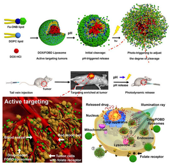 Qiao et al. designed a pH- and photo-dual-responsive multifunctional lipid (Fa-ONB lipid) consisting of activated folic acid combined with 4-(bromomethyl)-3-nitro-benzoic acid and a didodecylamine scaffold. The Fa-ONB lipid could be cleaved by both an acidic environment and UV light irradiation because of the o-nitrobenzyl ester bond. DOX-loaded liposomes composed of Fa-ONB lipid and dipalmitoylphosphatidylcholine (FOBD) showed an increase in drug release efficiency according to pH change and UV irradiation synergistically (Figure 14) [173]. Nisar et al. engineered a photocleavable and pH-responsive crosslinked nanovehicle. The hydrogel was prepared by functionalized CTS and a photocleavable crosslinker, 4-formylphenyl 4-((4-formylphenoxy)methyl)-3-nitrobenzoate (CHO–ONB–CHO). The hydrogel displayed not only a pH-responsive release behavior at acidic pH but also a photocleavable behavior of the crosslinker when absorbing the UV light (310–340 nm). These properties enabled drug release via hydrogel degradation [174].