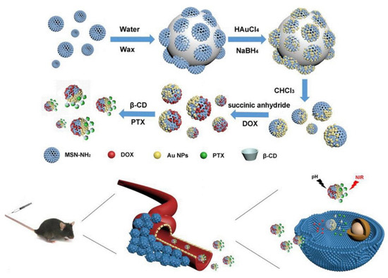 Knežević et al. constructed a photo- and pH-dual-responsive nanovehicle using nitroveratryl-carbamate-protected aminopropyl-functionalized MSNs. DOX was adsorbed on nitroveratryl-carbamate-protected aminopropyl-functionalized MSNs. The photo-cleavage of the carbamate linkages yielded the release of the drug from the nanovehicle. Under UV light irradiation, positively charged propylammonium groups were generated on the nanoparticle surface, leading to the desorption of positively charged DOX from the surface of the nanoparticles. An increase in DOX release was under a weakly acidic environment and prolonged irradiation time [175]. Xing et al. synthesized Janus Au-MSNs loaded with paclitaxel (PTX) and DOX (PTX-Au-MSN-DOX JNPs). The PTX-Au-MSN-DOX JNPs exhibited pH and NIR dual-responsive release properties. This system used thiol-β-cyclodextrin as a vehicle for PTX on gold domains, while the other MS part served as a vehicle for DOX. The pH-sensitive DOX release occurred because of the protonation and dissociation of their amine groups under acidic conditions, whereas the release of PTX was caused by the breakage of the Au–S bond under NIR irradiation (Figure 15) [176]. Lu et al. developed nanovehicles using a new generation of hollow MSNs (HMSNs) to address the issue of low drug loading in traditional MSNs. HMSNs were prepared to encapsulate rose bengal (RB) and DOX. The surface of HMSNs was modified with hyaluronic acid (HA) via pH-sensitive Schiff base bonds (RB-DOX@HMSNs-N=C-HA). The pH-responsive Schiff base bonds were designed to be hydrolyzed under acidic conditions, leading to DOX and RB release from HMSNs and inhibition of tumor cell viability under light illumination [173]. In a recent study, they fabricated a targeted HMSN-based DDS for cancer chemo-PDT. ICG and DOX were co-loaded into HMSNs. Dopamine-modified hyaluronic acid (DA-HA) was connected to the HMSNs through boronate ester bonds for blocking the mesoporous channels of the HMSNs (ID@HMSNs-B-HA). Boronate ester bonds are acid-sensitive bonds that can exist stably under alkaline conditions and break in a weakly acidic environment. DA-HA can wrap HMSNs well under physiological conditions while detaching from the surface of HMSNs under acidic conditions, resulting in drug release [177].