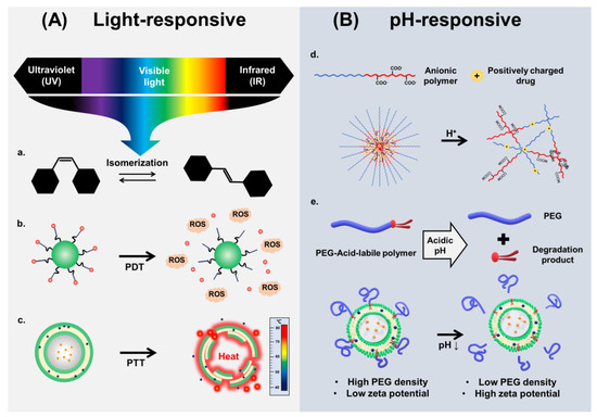 Schematic illustration of the concept of (A) light- or (B) pH-responsive drug delivery systems (DDSs); a. photo-isomerization, b. photodynamic responsive DDSs, c. photothermal-responsive DDSs, d. protonation-based DDSs, e. acid-labile bond cleavage-based DDSs.